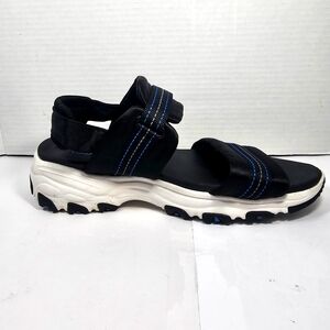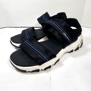 Chic Skechers sandals with black straps and blue accents. Durable white sole for comfort.