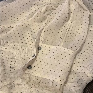 Beautiful blouse! Stunning retro vintage style top by Free People, size Medium. Sheer white with black polka dot print. Longer cut sleeves, frayed ruffles, longer in back, gorgeous silky fabric, but machine washable polyester. Freshly laundered in Tide Free and Gentle.