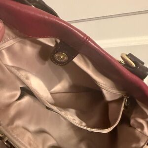 Stylish Coach shoulder bag. Rich red and brown leather. Gold-tone hardware. Perfect for any occasion.