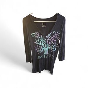 The product is a vintage American Eagle Outfitters Y2K top in size large, designed for women. This long-sleeve t-shirt features a V-neckline and comes in a basic gray color. The retro Y2K style gives it a unique and nostalgic look, perfect for those looking to add a touch of vintage flair to their wardrobe. With its comfortable size and classic design, this top is a versatile and stylish addition to any collection of women's clothing.