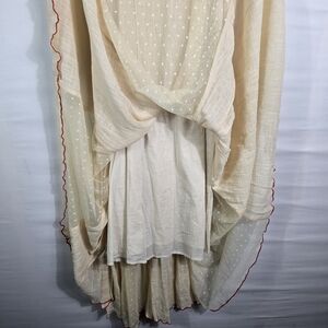 A flowy, cream-toned maxi dress with subtle dotted texture, red contrast stitching, and a tassel‑tie neckline that brings effortless bohemian energy. Lightweight, airy, and perfect for warm days, festivals, vacations, or easy weekend styling.