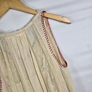 - Details: Sleeveless, V‑neck with tassel tie, red zigzag stitching, layered sheer panels, relaxed drape