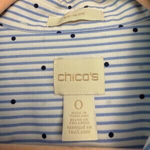Chico's No Iron Shirt Womens Large White Blue Striped Polka Dot Button Up Preppy