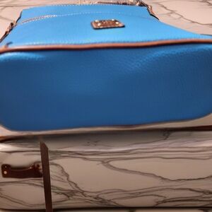 Dooney bourke stylish blue crossbody bag with brown accents. Features a front zipper pocket and adjustable strap.