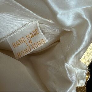 Beautiful Vintage Purse. The white beads and Sequins were applied to the cream satin fabric by hand, many decades ago. Gold metal & white Lucite (?) frame with gold chain handle. The exterior is impeccable with no missing beads or sequins, as is the satin interior. Kiss lock closure. The sequins have an Aurelia Borealis effect in the light. There is a very small interior pocket, and a tag that states Hand Made in Hong Kong. Love this purse and have had it for a long time, but I recently purchased a similar one that I use more. Time for some fresh new love! ❤️