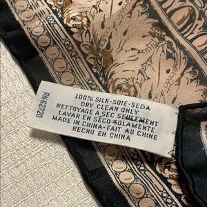 Luxurious vintage 100% silk scarf with intricate patterns. Features a classic black and cream design. Ideal for elevating any ensemble. 34 inches x 34 inches. Vintage. Shows minor signs of wear around edges of scarf. Shown in photos.