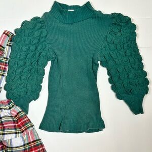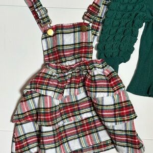 Stylish plaid jumper dress paired with a green puffed sleeve sweater. Perfect for a festive holiday look. Dress and sweater can be worn together as an adorable ensemble or as cute separates. Excellent pre-owned condition (outfit worn and washed once). Size 12-18 months.