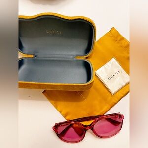 Stylish sunglasses by Gucci. Features a bold pink frame. Perfect for a fashionable look. Worn maybe twice. These are no longer in production and they released around 2019 during Alessandro Michele’s time at Gucci. Includes Case, pouch and cleaning cloth! $299 or best offer!