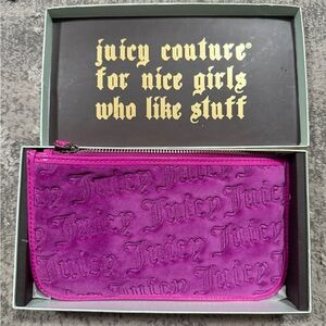 Fuchsia Juicy Couture wristlet. Embossed logo design. Includes chain detail and heart mirror. NWT and box