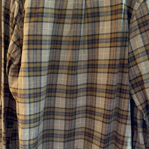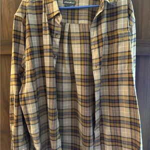 Eddie Bauer plaid shirt with a mix of brown, tan, and black. Ideal for casual wear.