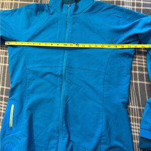 Teal Arc'teryx jacket with a sleek design. Features a convenient full-zip closure. With thumb holes