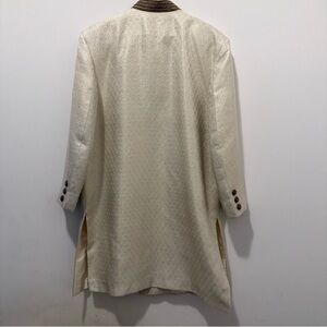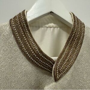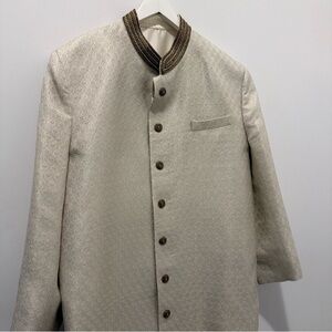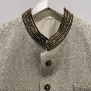 This elegant cream sherwani is perfect for special occasions. Its classic design offers a sophisticated look. Beautiful beaded detail. No signs of wear at all. Unfortunately not a fit for my partner, so re-poshing.