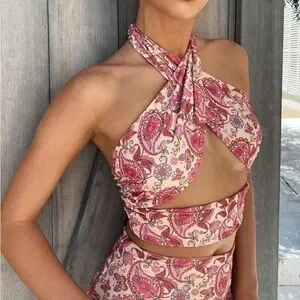 Chic pink paisley crop top. Stylish halter design. Perfect for a bold look.