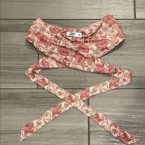 Tiger Mist Pink Paisley Print Criss Cross Boho Wrap Halter Top. This beautiful top has different bold hues of pink and a Strappy halter tie neckline. The inside of the garment around the bust is lined with non slip adhesive to help keep it in place.