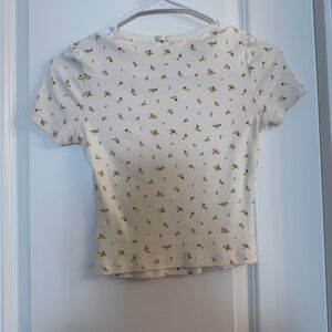 Chic and soft cotton rib tee. Features delicate floral print. Ideal for casual wear.