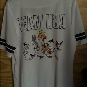 Stylish white jersey with Bugs Bunny and Olympic rings. Features black trim and button-up front. Brand new with tags
