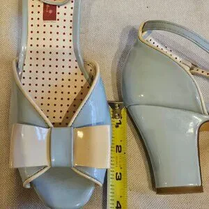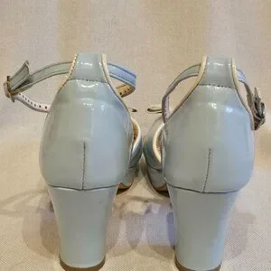 So cute! Baby blue and cream patent finish. Small platform, chunky heel and a cute bow on top!