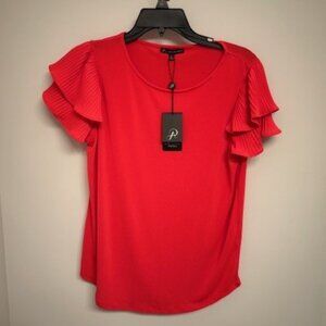 Adrianna Papell Solid Knit Pleated Double Flutter Blouse Red Small
