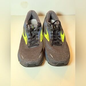 Stylish Brooks athletic shoes. Gray upper with vibrant yellow accents. Perfect for running and training.