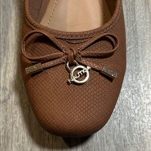 Elegant brown loafers with a textured design. Features a stylish bow accent. Perfect for everyday wear. It has small scratch, you can see it in the photos
