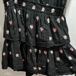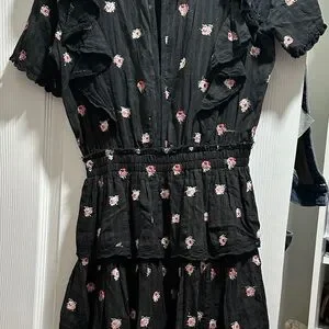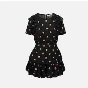 Adorable black dress with pink floral details. Features ruffled sleeves and layered skirt. Ideal for casual outings.