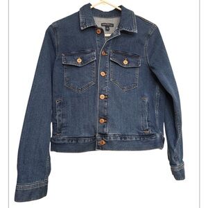 Classic blue denim jacket with button front. Features chest pockets and long sleeves. Size Small