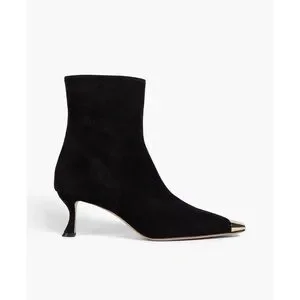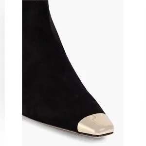 The boots shown are the Alexandre Birman Olivia 60 embellished suede ankle boots. These black suede boots feature a gold-tone square cap toe and a geometric, covered block heel. They are crafted in Italy and have a retail price of around $995.