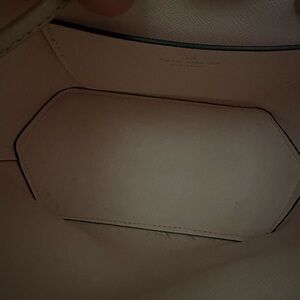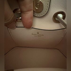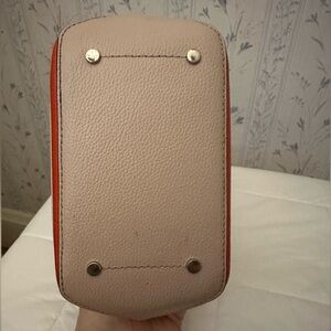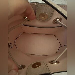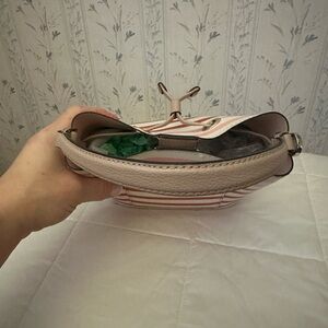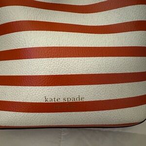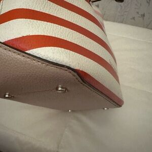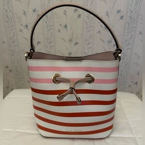 Cute bucket bag with pink and red stripes. Features a drawstring closure. Ideal for a stylish look. Missing crossbody strap. Very good used condition with very minor wear, mostly on the bottom. Please see all pictures. 10”W x 8”H x 4”D