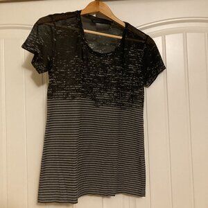 AllSaints Black and Gray Short Sleeve Top Small Striped Sheer Cotton Polyester
