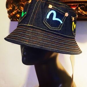 Evisu Multi-color Seagull Print Multi-Pockets Denim Bucket Hat NWT w Bag