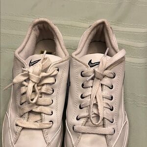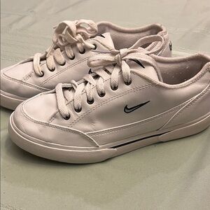 Comfortable white sneakers with lace-up design. Features iconic Nike logo. Size 7.5