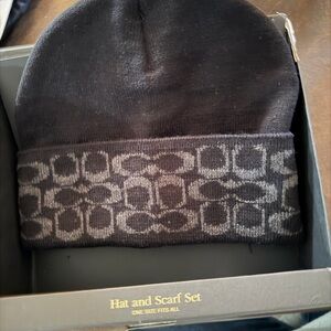Coach Black and Gray LOGO Patterned knit hat and Scarf Set. Original! New in Box Sophisticated beanie and scarf set by Coach. Features a stylish black and gray pattern. Perfect for warmth and style. NEW!! With tags