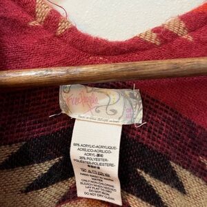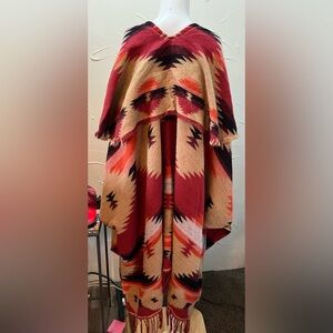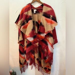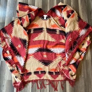 Make a statement in this classic and bold western style poncho. Arm holes, colorful print and frayed end design