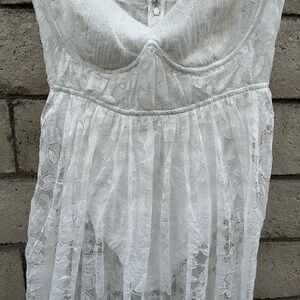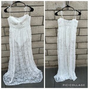 Lorena is a vintage-inspired sheer floral lace dress with a flowy maxi skirt, pin-tucked sweetheart cups with underwire, and delicate functional ties at the shoulders. Bodysuit lining with invisible zip closure at back bodice. Snaps at the crotch.