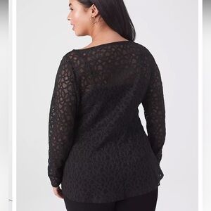 Boat neck. Long sleeves. Peplum hem. Sheer lace. Standard length. Layering piece/cami sold separately.