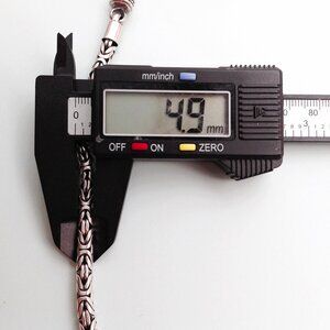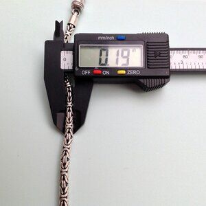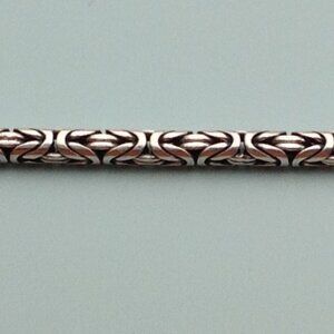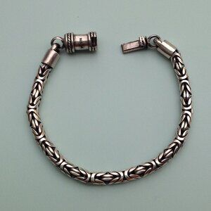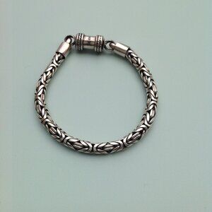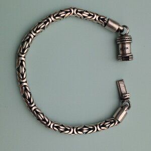 Sterling Silver 925 Byzantine Bracelet w Barrel Clasp 7.5". Some antiquing in the links. Supple chain feel. Captivating interwoven links. 7.5" usable length, as the last 0.5" disappears into the barrel when closed. Perfect for a man or a woman, depending on the fit, of coarse. Excellent condition. Marked 925 on clasp.