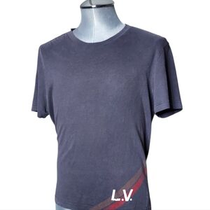 LV painted monogram logo with chateau racing stripe behind it near the waist of the shirt