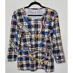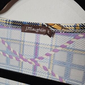 J.McLaughlin women's long sleeve top in size XL featuring a bold plaid pattern interwoven with a nautical rope and ribbon print. The neckline is a classic scoop neck, and the sleeves are a comfortable three-quarter length. This top offers a unique blend of classic and statement design elements.