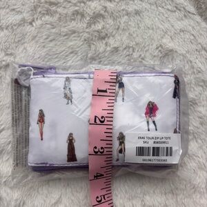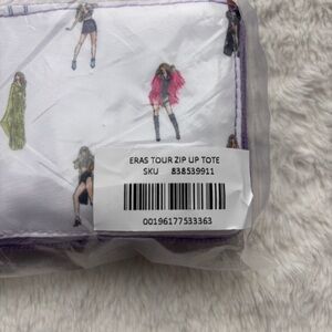 • Item: Official Eras Tour Zip Up Tote (Packable Shopper) • Design: White nylon fabric featuring the iconic "Eras" illustrations of Taylor in her various tour outfits. • Features: • Folds into a small, zippered rectangular pouch for easy storage. • Purple zipper detailing. • Expandable into a full-sized tote bag (perfect for carrying merch, groceries, or daily essentials). • SKU: 838539911 (Authentic Tour Merchandise) Condition: New in Package (NIP). The item is unused and mostly kept in its original plastic packaging (only opened briefly for photos). Measurements (Folded Pouch): • Width: ~4.5 inches • Height: ~6.5 inches • (Expands to a standard tote size)
