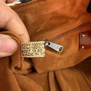 Magnetic snap closure, rear slip pocket, leather trim with burned edge finish, top handles, adjustable/detachable strap