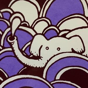 “Whalephant” featuring a swimming elephant surrounded by purple and burgundy coloured waves is an original silkscreen print by Jacob Rolfe.