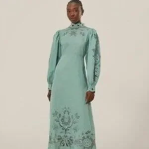 This is a gorgeous gem from Farm Rio -- linen/cotton blend makes this soft and comfortable, with latticing at the sleeves and back. Functional buttons for the mock neck, but a side-zip to help make in an out efficient. I wore this dress once for an early spring farm wedding. Dry cleaned and ready for its next adventure with you! There is the smallest loosening of threads at the zipper (pictured and not noticeable when worn). The tag showed through on the back latticing, so I removed those, but the materials tag is still intact. Size Medium, good fit for a 6-8.