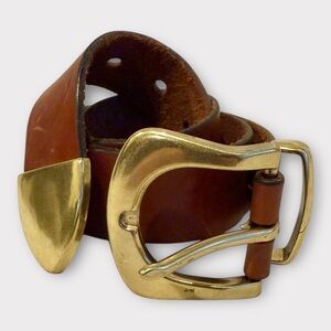 Vintage Cognac Brown Leather Belt with Brass Buckle Sz M. This rich brown leather belt with brass accents is crafted with artistic precision, that is infused with a touch of classic charm. It’s a masterpiece that speaks volumes when wearing it, by merging a casual and effortless style, while allowing you to create a distinctive look all on your own. 3-piece sculpted buckle set in a vintage brass finish. Width 1.5”. Hand Burnished vintage, leather. 5 holes for sizing versatility. Size medium. 37” tip to tip. Holes range from 27.5”-31.5”. Leather shoes minor wear which adds to its character. Enjoy!