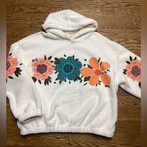 Easel. Teddy Fleece Sherpa pullover. Off white with unique graphic Fall flowers. Great condition. Pockets. Oversized and dropped shoulders. Elastic waist and cuffs. Super soft. Size Large