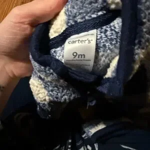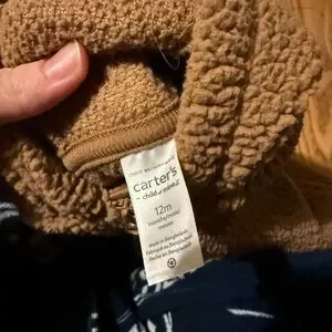 Carters fleece coveralls. Great for wearing with car seat to keep baby warm. One pair is 6-9m and the other is 9-12 months. Barely worn