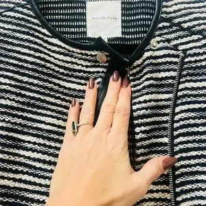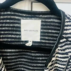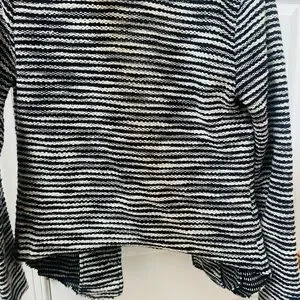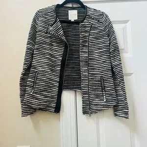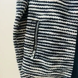 Stylish blazer with bold black and white stripes. Features a modern design with zippered pockets.