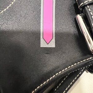 This elegant black crossbody bag by Coach features a stylish buckle and adjustable strap. This purse has been gently used and has very minor imperfections x2 (sees arrows).