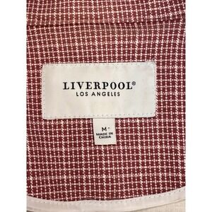 Elevate your wardrobe with this chic Liverpool Los Angeles blazer. Its classic red and white gingham pattern offers a sophisticated yet playful touch, perfect for transitioning from day to night. The single-button closure and tailored silhouette create a flattering and professional look, while the subtle texture adds depth and interest. Wear it to command attention at your next business meeting or add a polished layer to your weekend ensemble. Please see photos for measurements. Comfortable stretch material.