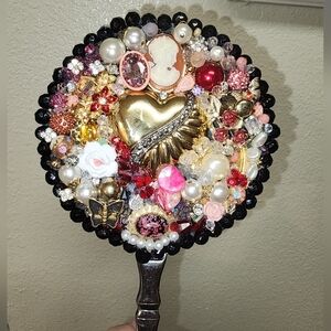 stunning ine of a kind upcycled hand mirror adorned with colorful jewels and pearls. Features a heart and cameo design. Perfect for adding a touch of vintage charm.