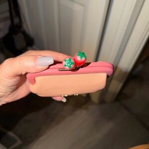 Stylish Coach wristlet in pink and peach. Features a playful strawberry clasp. Ideal for essentials.